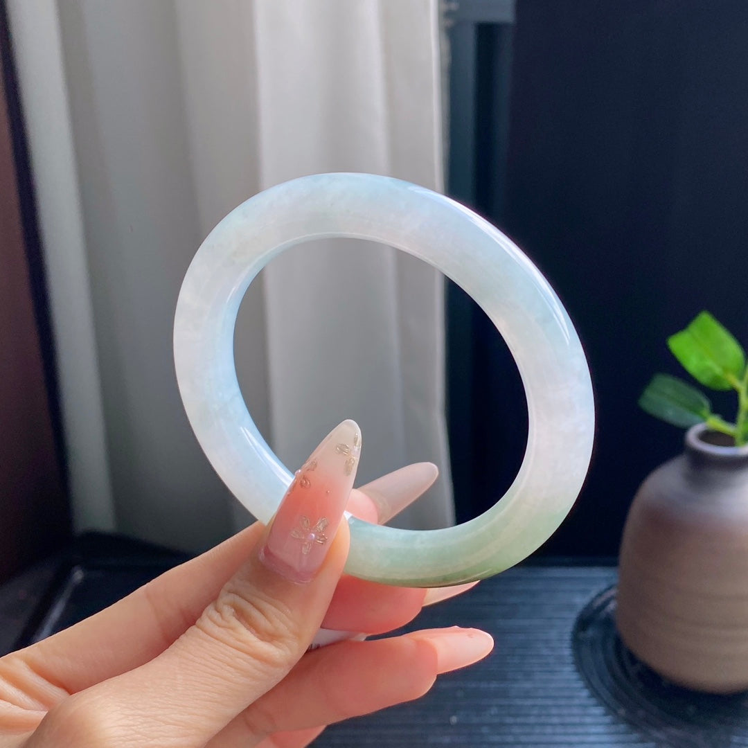 This 100% natural jadeite bangle has an icy, translucent base. A vivid splash of olive green drifts across it, making it rich in color and with an elegant charm. It brings a dignified and classic grace, and is perfect for adding a touch of timeless elegance to any look.