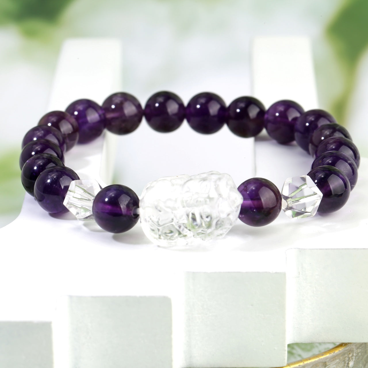This Amethyst Lion Dance Bracelet features amethyst beads and exquisite lion shaped white crystal. In Western cultural, amethyst is often associated with spirituality, wisdom, and inner peace, and is regarded as a gemstone that can bring positive energy. The lion, as a vibrant and auspicious image, symbolizes courage and good luck. The bracelet skillfully combines the mysterious charm of amethyst with the cultural connotation of the lion. Each amethyst bead has a lustrous and smooth surface, and the lion carving is delicate and vivid. Whether worn daily to add a unique temperament or given as a gift with good wishes, it is very suitable and brings you a different style and positive psychological hints.