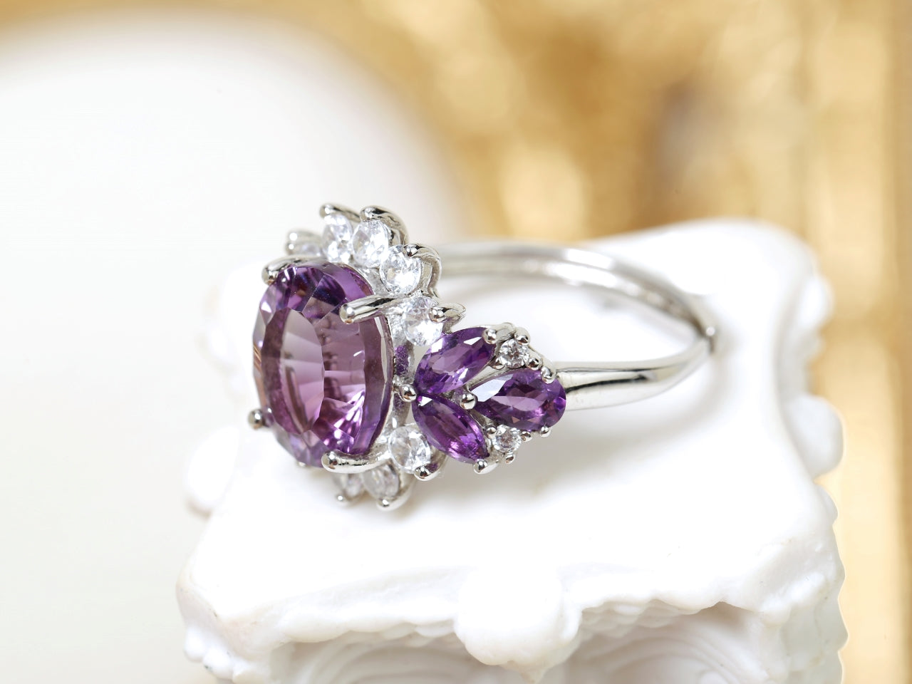 This amethyst ring features a large, vibrant purple amethyst at its center, surrounded by sparkling diamonds and smaller amethysts, creating an elegant and eye-catching design.