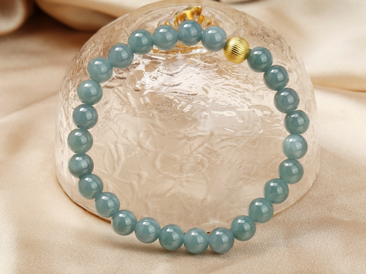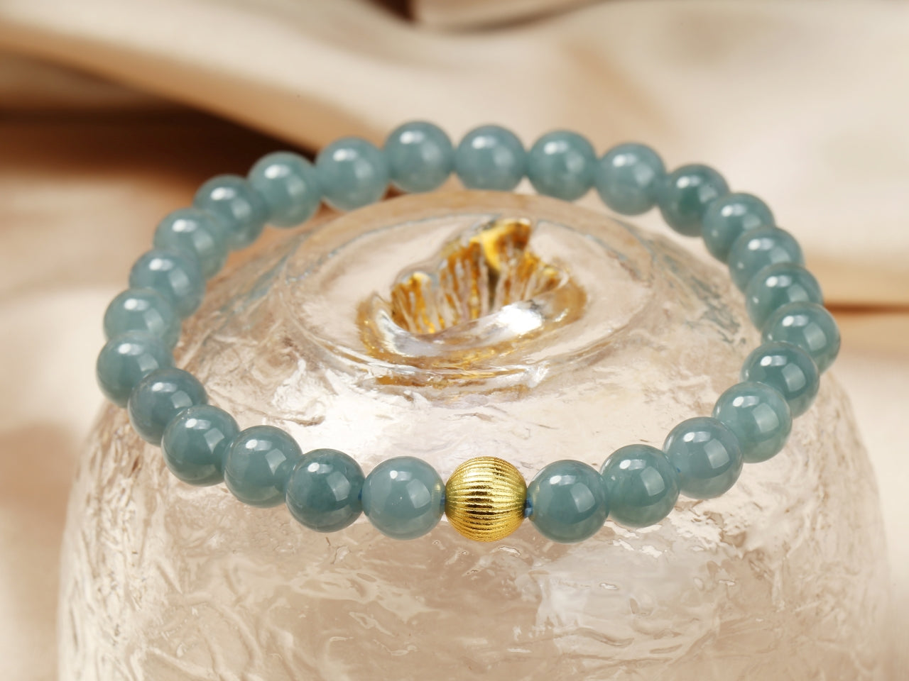 This blue water round bead jadeite bracelet features smooth round beads in a blue green tone. A hollow - carved gold bead with turquoise inlays sits at the center, adding a touch of luxury. Placed on a glass base against soft silk, it blends elegance with unique craftsmanship.