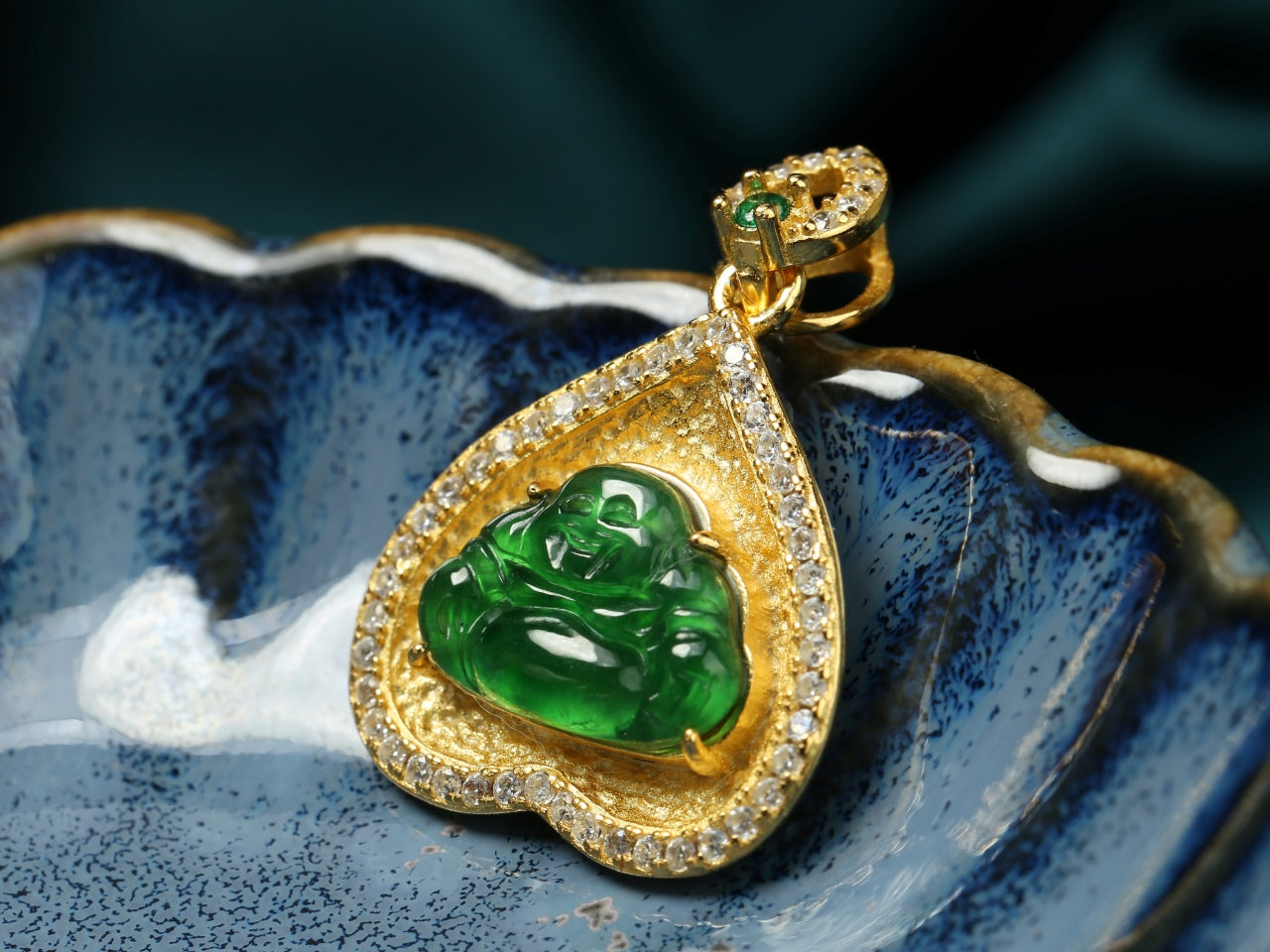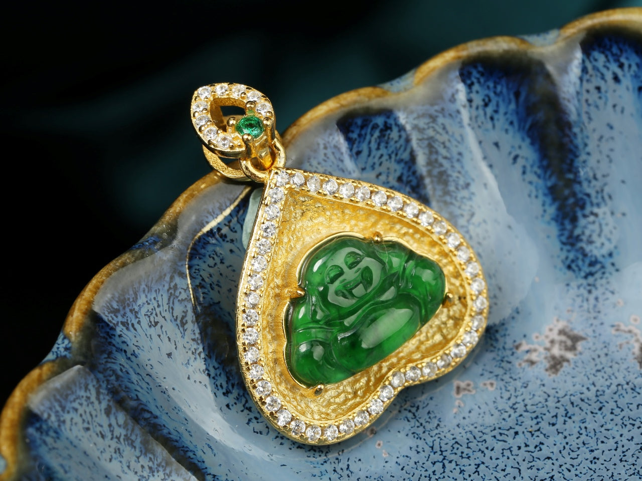 A heart-shaped gold pendant featuring a vibrant green jadeite Buddha, encircled by sparkling diamonds. Topped with a small green gem, it has a blue plate, blending spiritual symbolism with delicate craftsmanship.