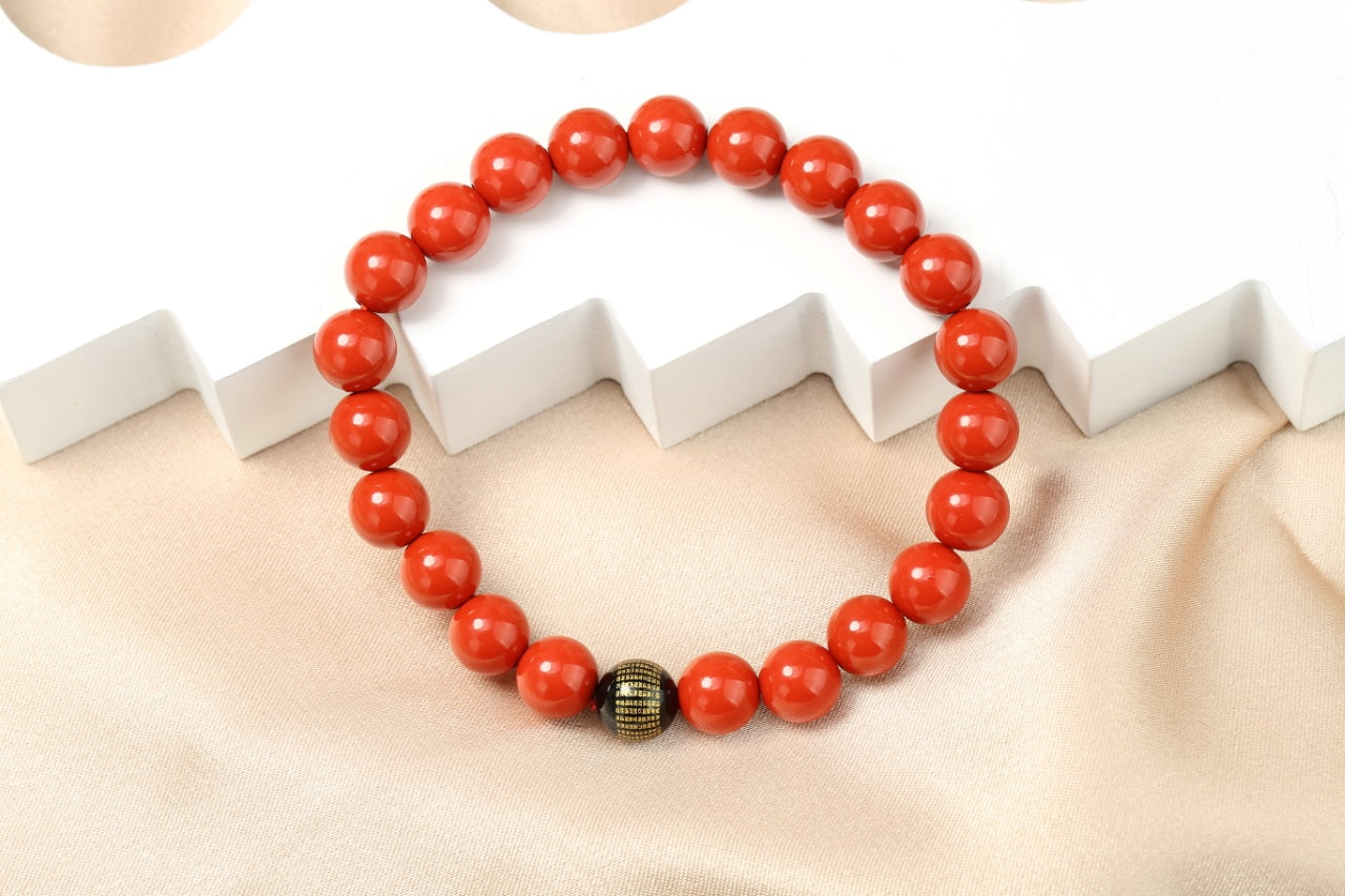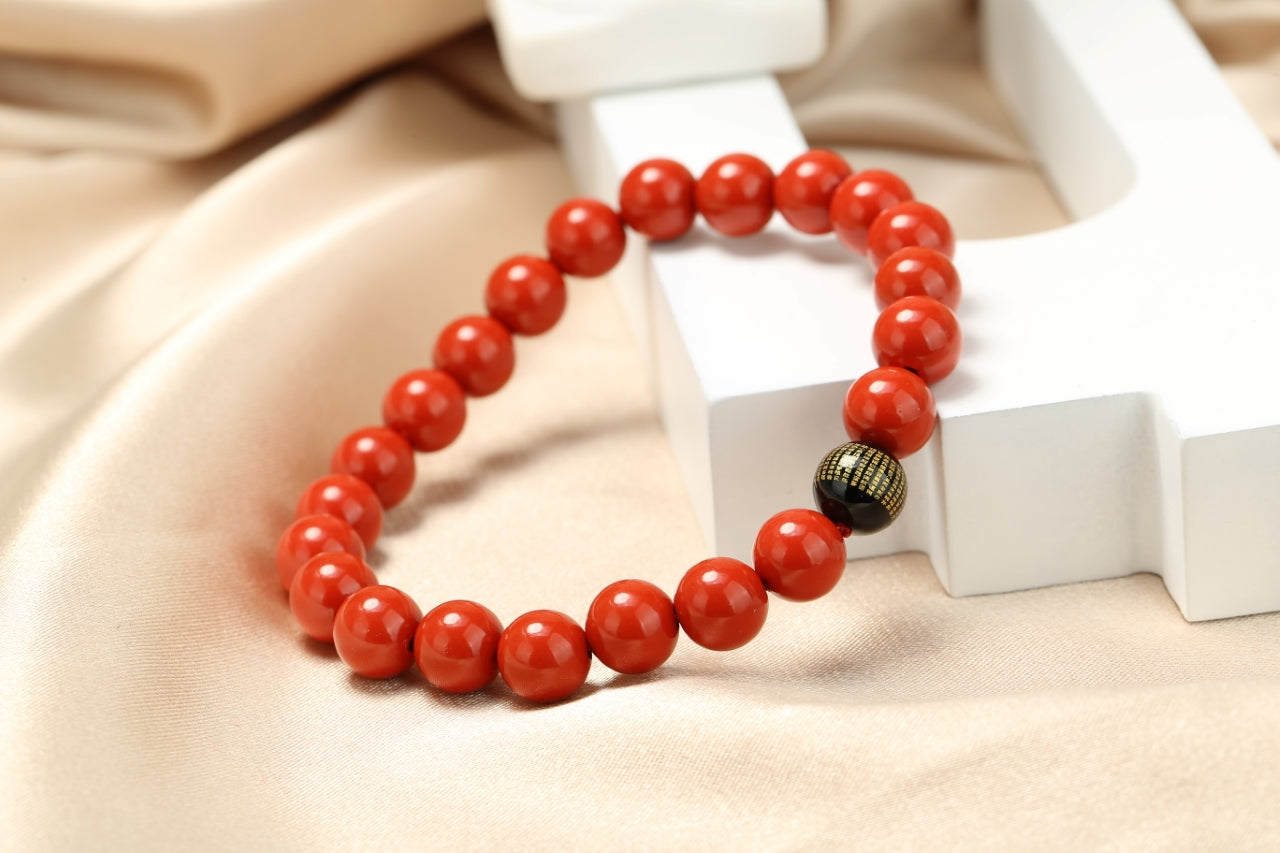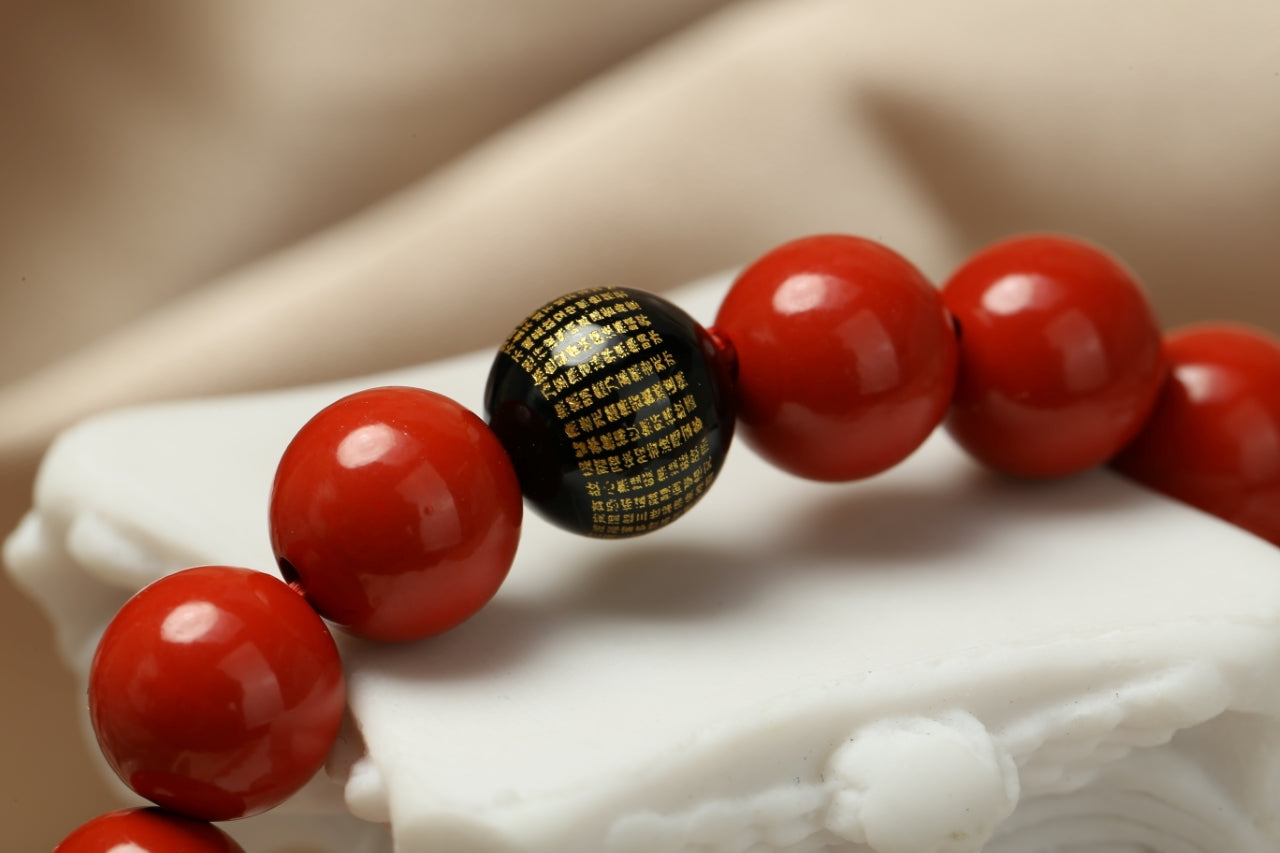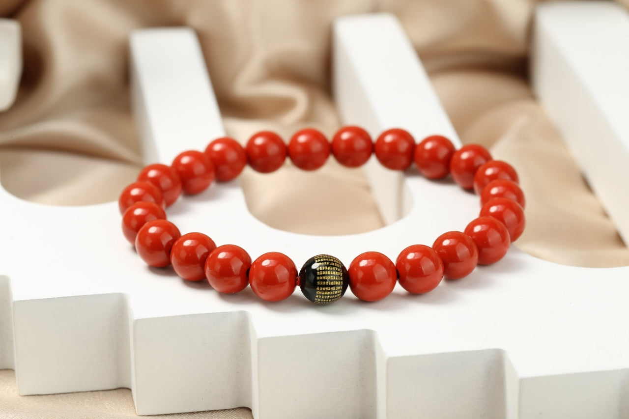 This Cinnabar Agate Bracelet has 8mm beads. The bracelet is mainly made of bright - colored cinnabar beads, matched with a black agate bead engraved with golden characters, which is unique and eye - catching. Cinnabar is often regarded as a gemstone with protective significance in culture, while agate is deeply loved for its tough texture and beautiful patterns. The overall design combines traditional elements with a sense of fashion. It fits snugly around the wrist when worn. It is suitable for creating a personalized style in daily matching or as a gift with good meanings, adding unique charm to the wearer.