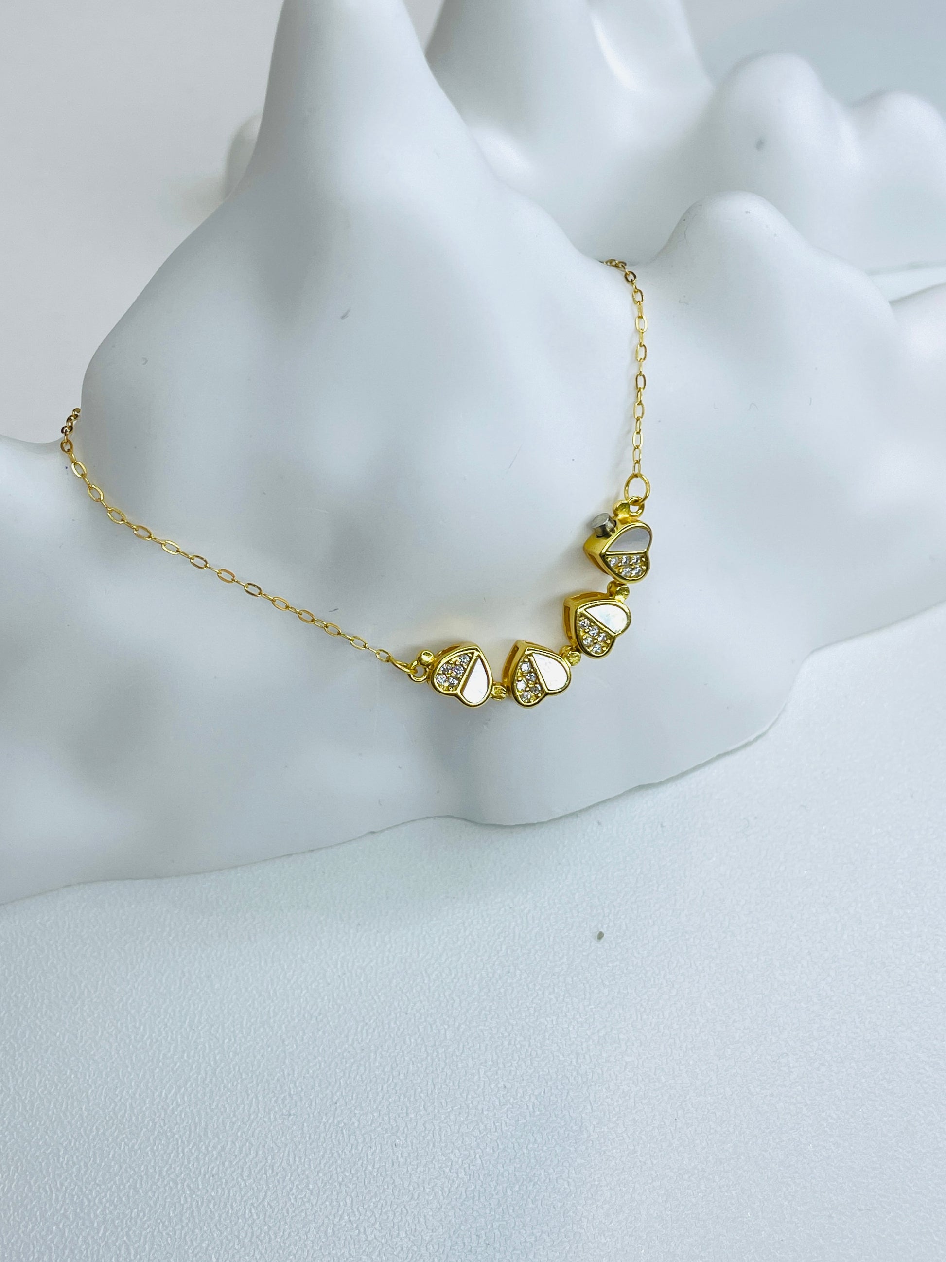 Elevate your jewelry collection with this Gold Heart & Clover Mother-of-Pearl Necklace Set. Featuring delicate heart and clover motifs paired with lustrous mother-of-pearl, it blends romance and elegance. The golden finish adds a touch of luxury, making it perfect for daily wear or special occasions. A must-have for those who love feminine, detailed jewelry with a timeless appeal.