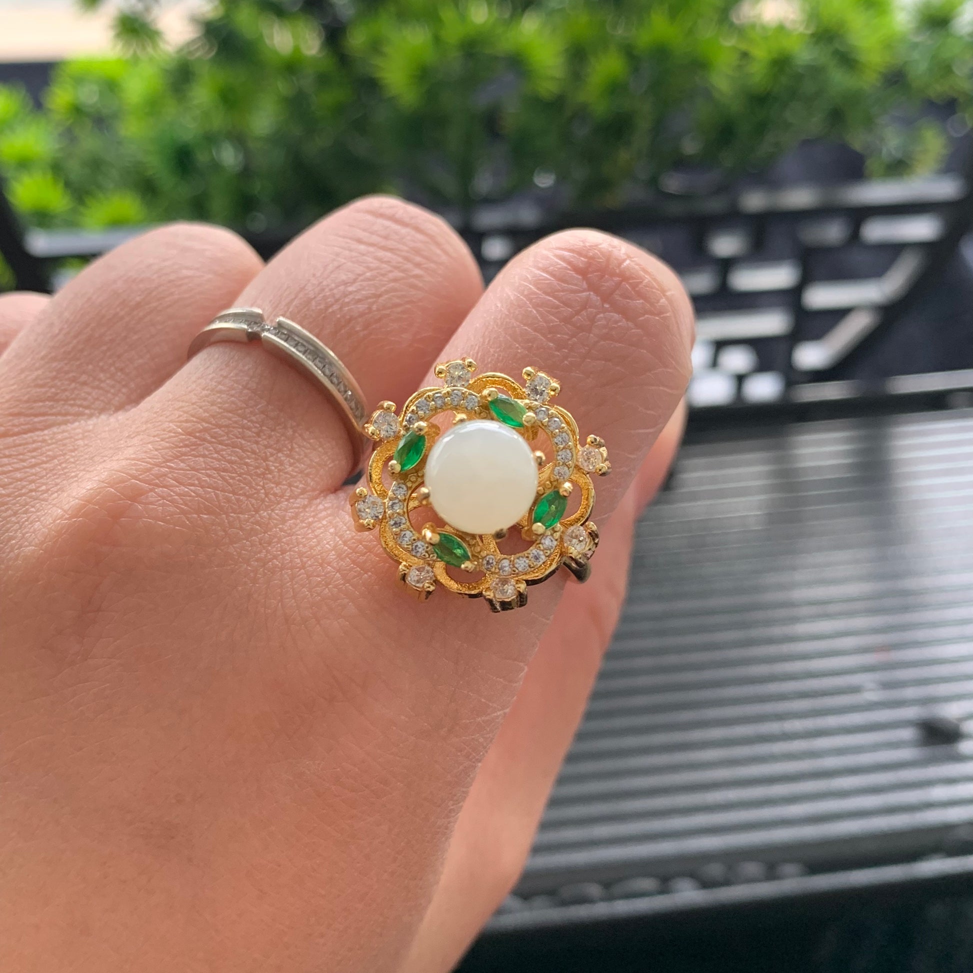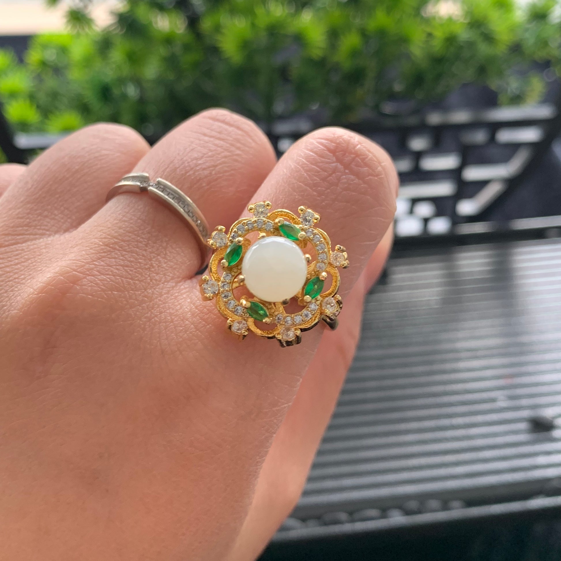 This ring centers natural Hetian white jade, framed by shimmering accents and emerald - hued details, with gold - toned filigree for vintage charm. Hetian jade represents purity and good luck. Ideal for daily wear or special moments, it merges Eastern beauty with modern luxury—a great pick for gifting or personal style.