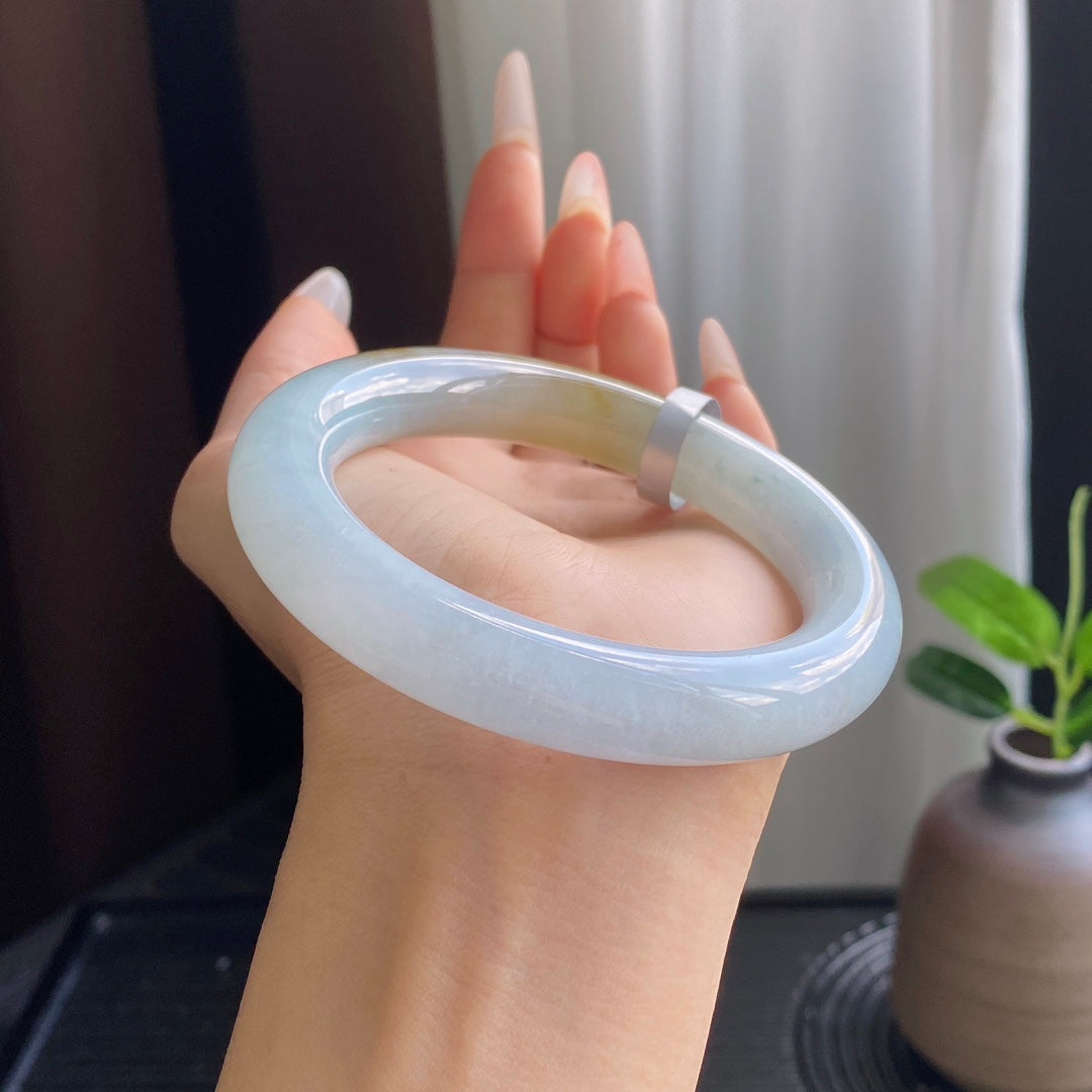 This 100% natural jadeite bangle has a smooth and gelatinous base. It has a pale blue base with a touch of honey-yellow drifting through, plus some dark speckles adding charm. It is graceful and elegant, perfect for both daily wear and special occasions. No artificial treatments, authentic jadeite with timeless beauty.
