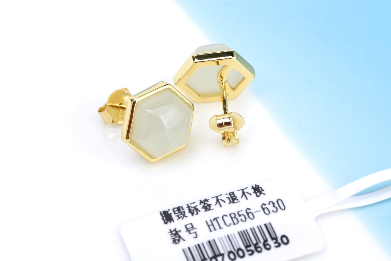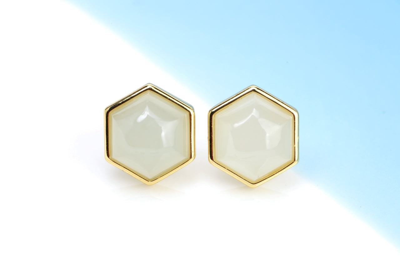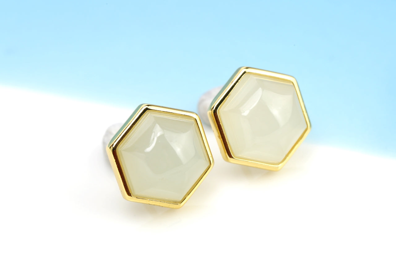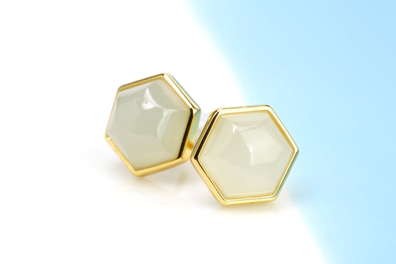 Natural Hetian Jade Hexagon Stud Earrings | Geometric Modern Elegance