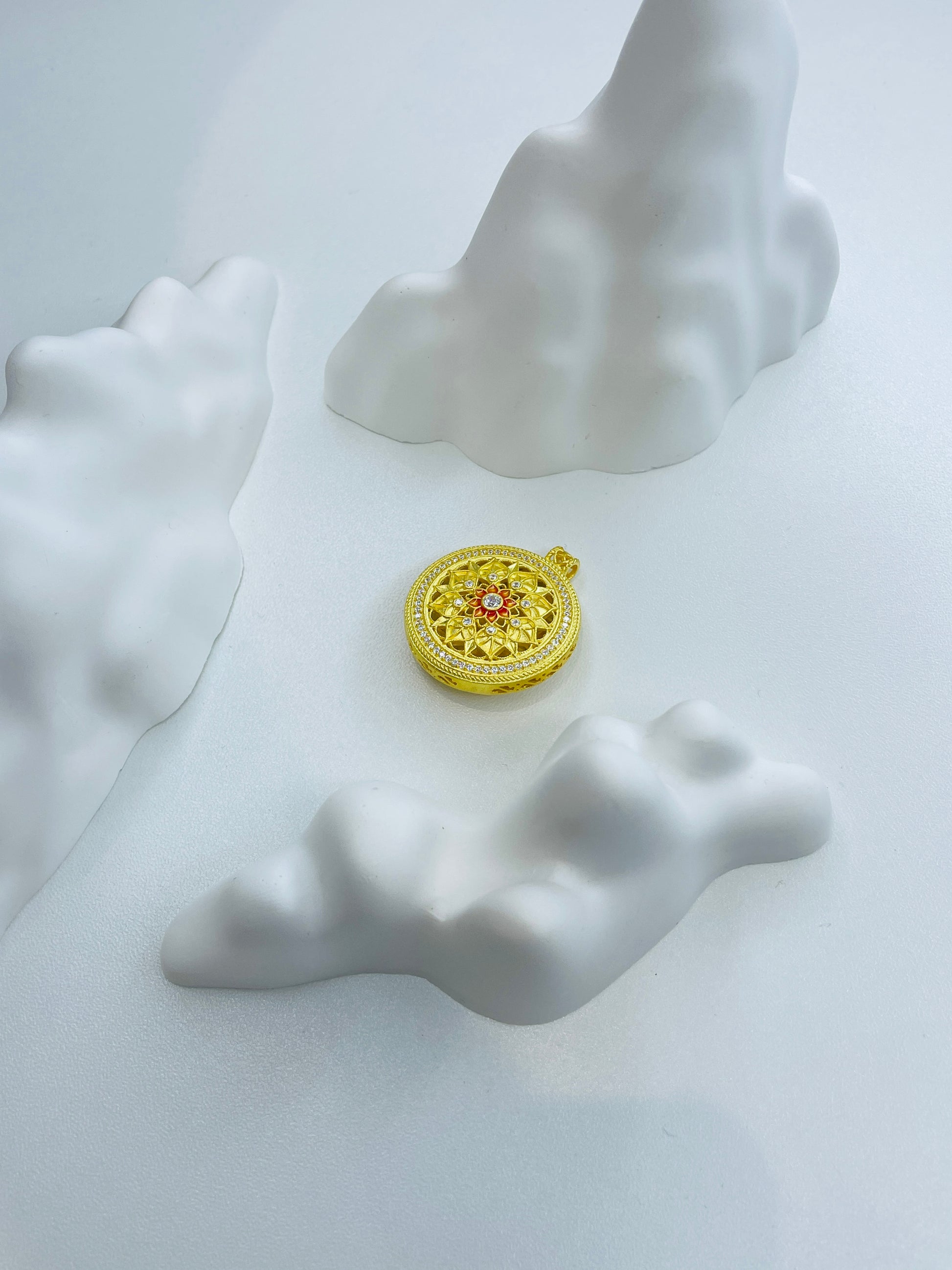 Elevate your jewelry collection with this Orange Lotus Hollow-out Gold Pendant. Crafted with intricate hollow-out lotus design, accented by orange details and sparkling embellishments, it exudes elegance and artistry. The golden finish adds a touch of luxury, making it a perfect piece for both daily wear and special occasions. A unique choice for those who appreciate detailed, culturally inspired jewelry.