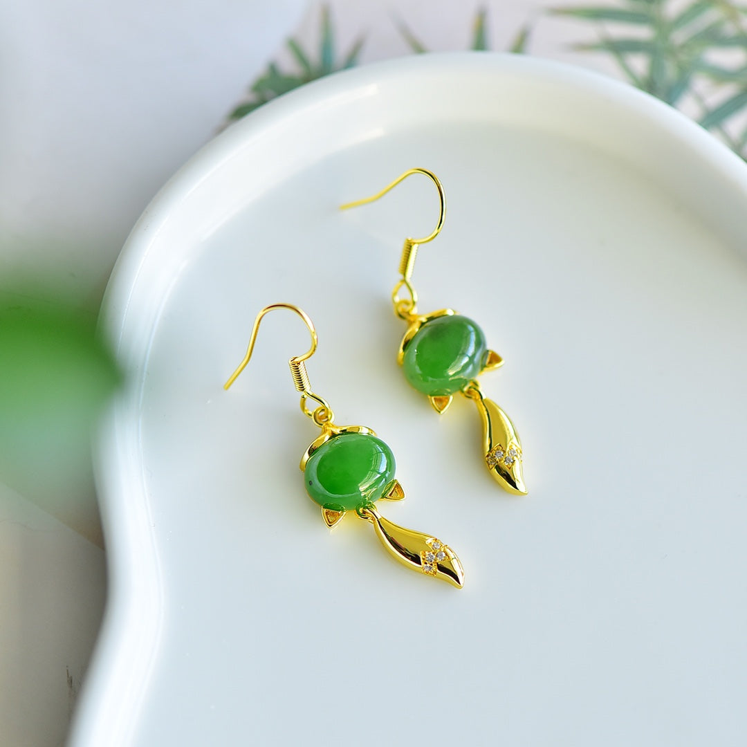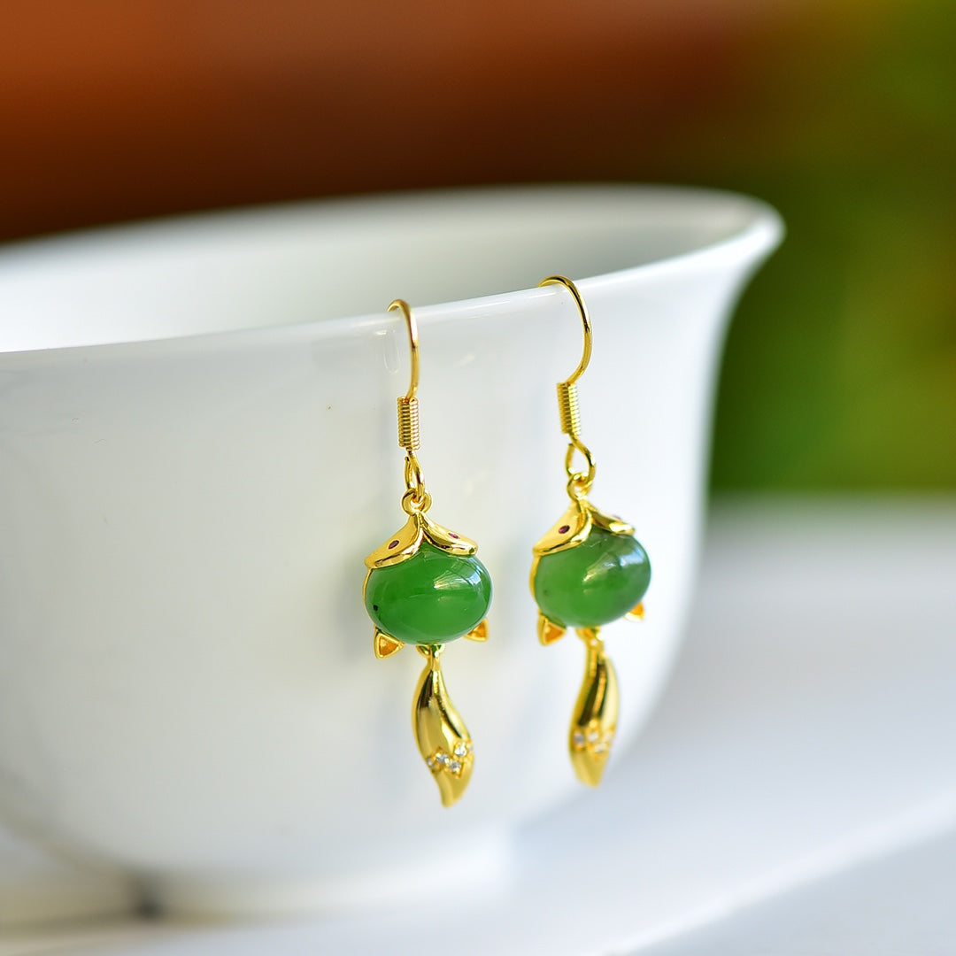 Crafted with natural white nephrite jade cabochons—warm, smooth texture with soft luster. The delicate fox design adds playful elegance, paired with hypoallergenic durable metal setting (e.g., S925 silver/18K gold) for sensitive ears. Dainty dangle style sways gently, eye-catching yet not bulky. Symbolizes wit & good fortune, blending jade’s peace vibe. Perfect for daily wear or small occasions (brunches, dates). Easy care: wipe with a soft cloth. A timeless, charming piece that elevates any outfit.